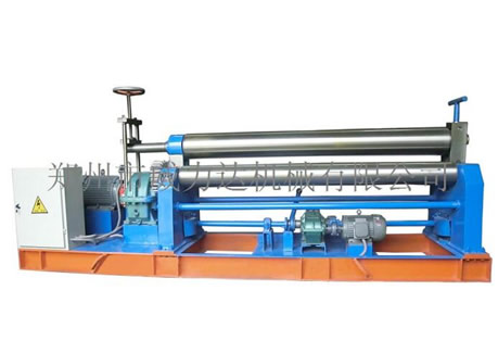 該機(jī)為手動(dòng)對(duì)稱式三輥卷板機(jī),兩下輥為主動(dòng)固定輥,正、反向旋轉(zhuǎn)運(yùn)動(dòng)有主電機(jī)帶動(dòng)減速機(jī)提供的彎曲扭矩來實(shí)現(xiàn);上輥在兩下輥中央對(duì)稱位置做升降運(yùn)動(dòng),上輥升降運(yùn)動(dòng)靠手板手輪帶動(dòng)升降絲桿來實(shí)現(xiàn)。該機(jī)結(jié)構(gòu)簡單,操作方便,適合8毫米以下板材。